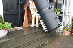 ... anbei die Bilder vom Treppensteiger in Aktion. Die Einbringung in den Keller hat gut funktioniert, habe aber eine zweite Person benötigt, um die Balance zu halten, da der Schwerpunk des Holzkessels weit vor den Rollen lag und bei den Pufferspeichern (Höhe 210 cm) musste ich weit nach unten schwenken, El-Treppensteiger damit sie durch die Tür gepasst haben. Ohne den Treppensteiger hätte ich die Puffer und den Kessel nicht in den Keller bekommen. Den alten Kessel habe ich alleine nach oben transportiert bekommen, da der Schwerpunkt besser zur Achse lag...